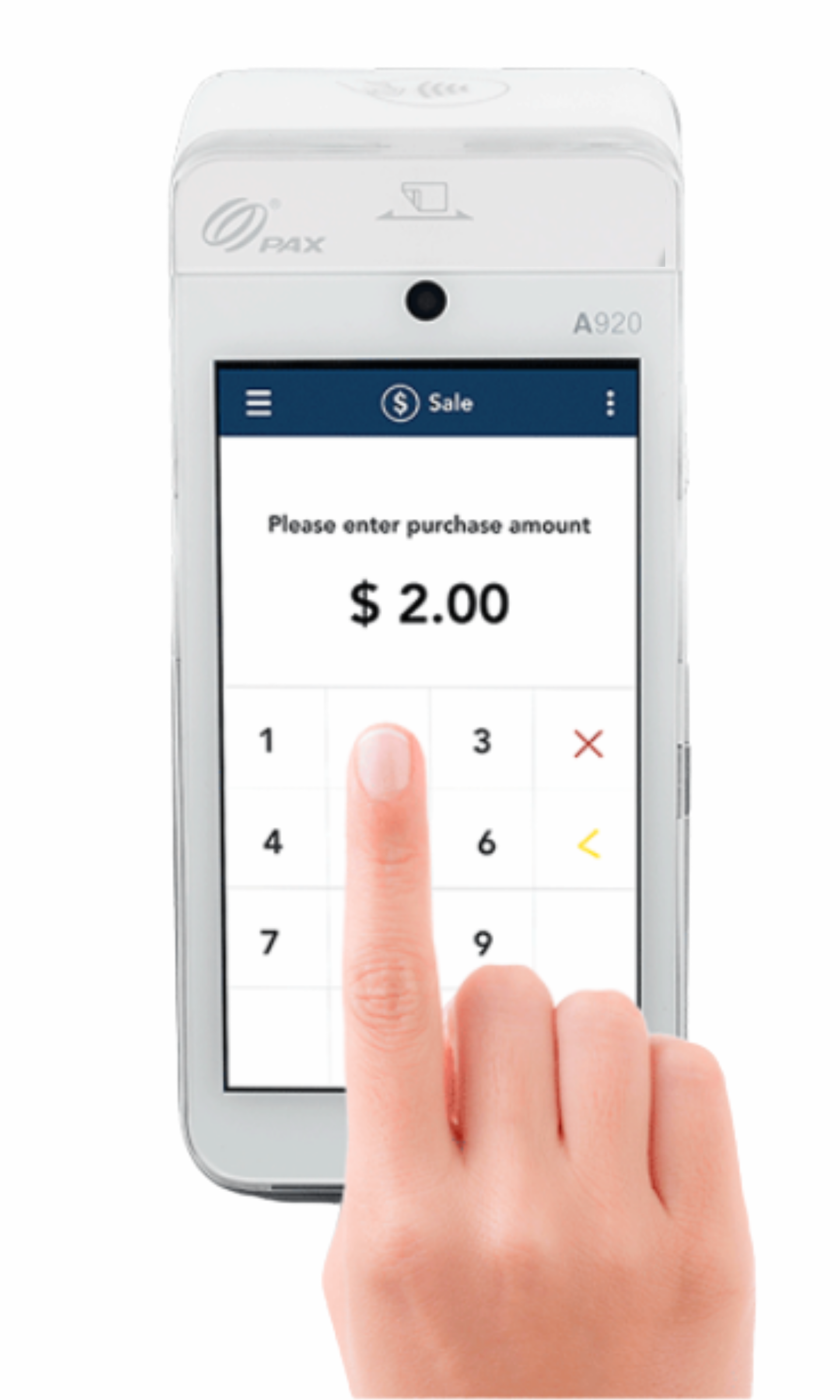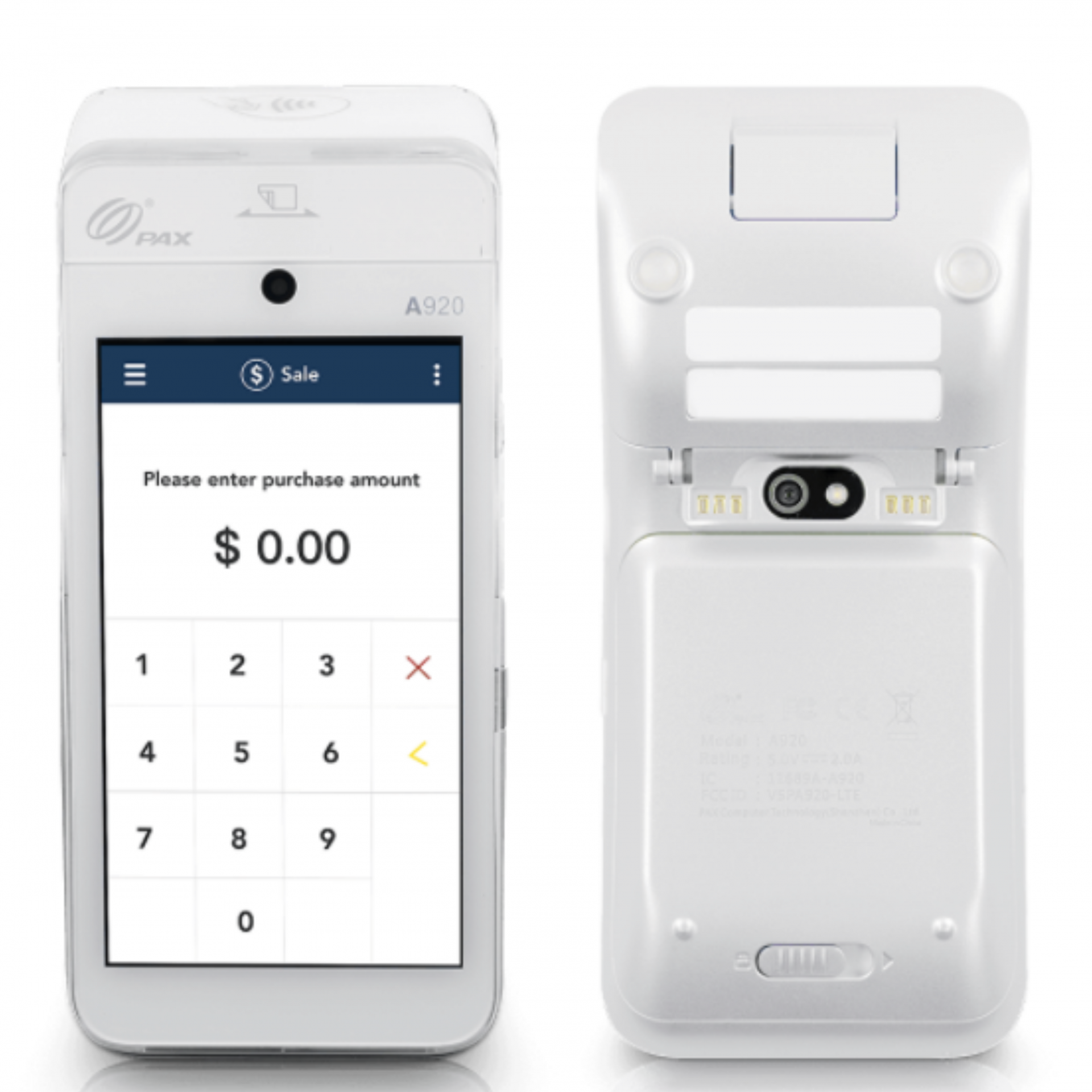 The hybrid terminal and point of sale powered by Pax. Includes 4G and wifi connectivity, an 8” HD touchscreen, 4.3” customer-facing touchscreen, receipt printer, and barcode scanner.
